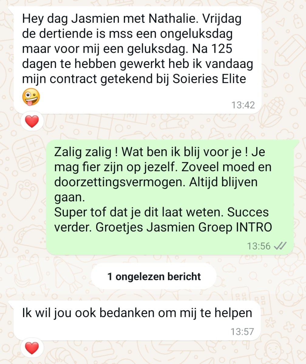 Dit met uiteindelijk een positief resultaat voor iedereen. Je moet weten, het blijft niet regenen, de zon komt sowieso toch tevoorschijn 😉 Alleen vraagt het de nodige moed en doorzetting. Vandaar mijn dank aan Groep INTRO en in het bijzonder aan mijn begeleidster.”